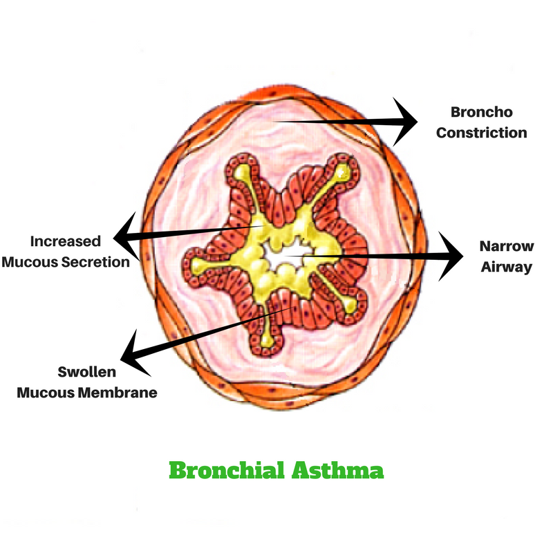 In bronchial asthma, the airway is hypersensitive (very sensitive) to allergens (Triggers producing allergy) and becomes narrow, thereby producing difficulty in breathing, cough and wheeze.